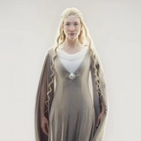long hair and is adorned with what appears to be a necklace or ornamentation on her chest. Her gaze is directed straight ahead, and the setting suggests a calm and regal atmosphere, possibly hinting at a role of authority or significance within
