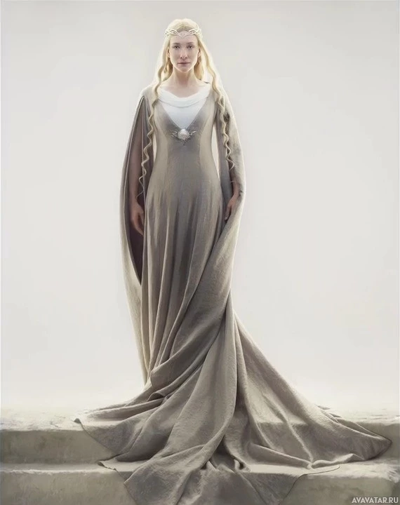 a female character dressed in an elegant, flowing dress with a cape-like design. She has