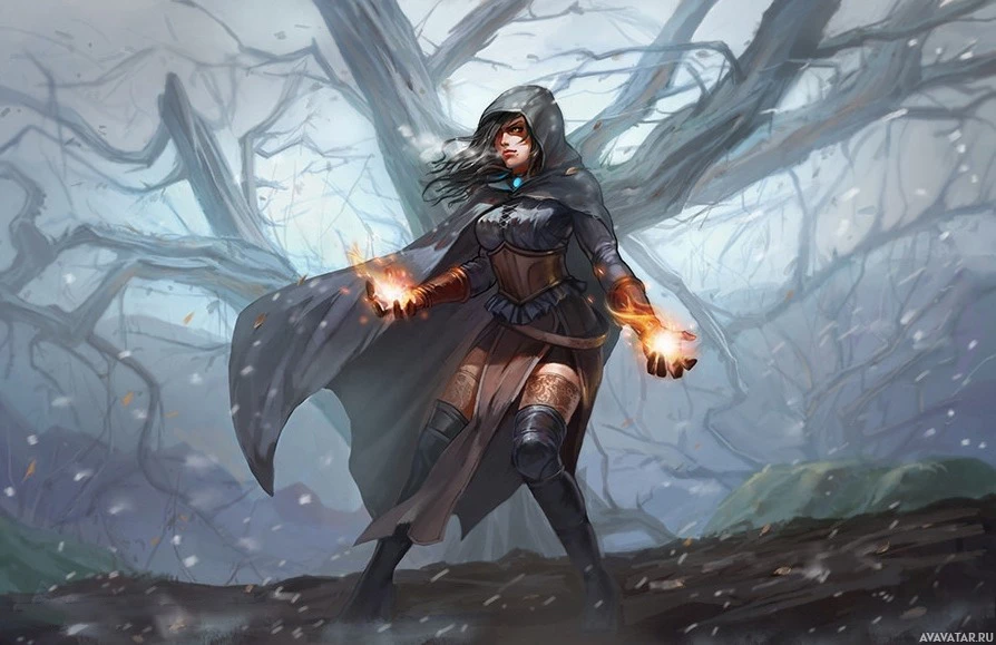 a fantasy character, who appears to be a female warrior or mage. She is dressed in armor and a cape with a hood, suggesting she might be a part of a knightly order or