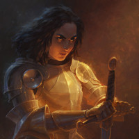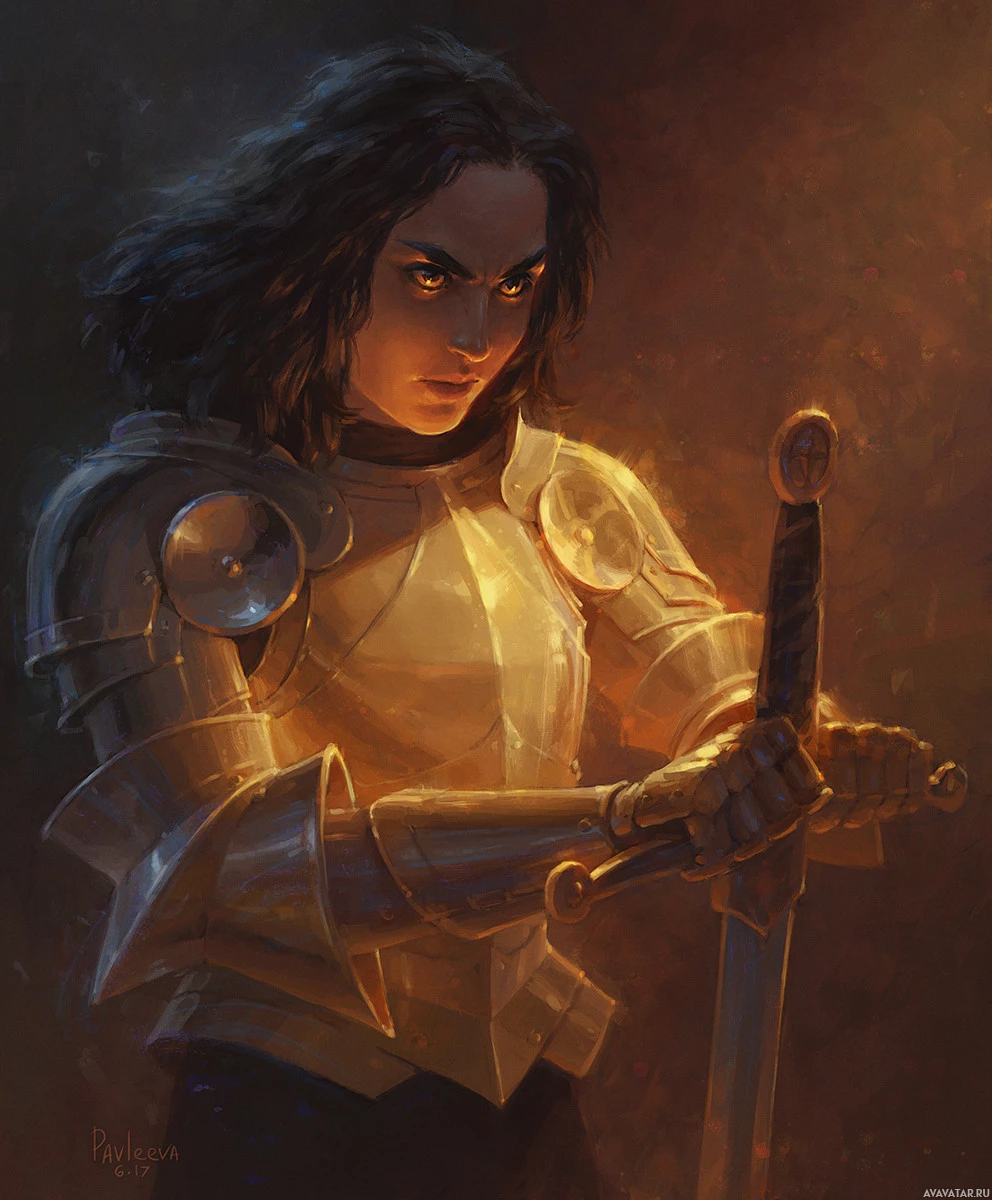 medieval armor, including a breastplate and helmet. She is also holding a sword with both hands, positioned ready for combat. Her expression appears intense or serious, suggesting that she may be preparing for battle or portraying a warrior-like demeanor. The lighting in the image gives it an ominous or dramatic atmosphere, further emphasizing her character as