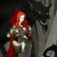 The image depicts a scene that appears to be inspired by the traditional story of "Little Red