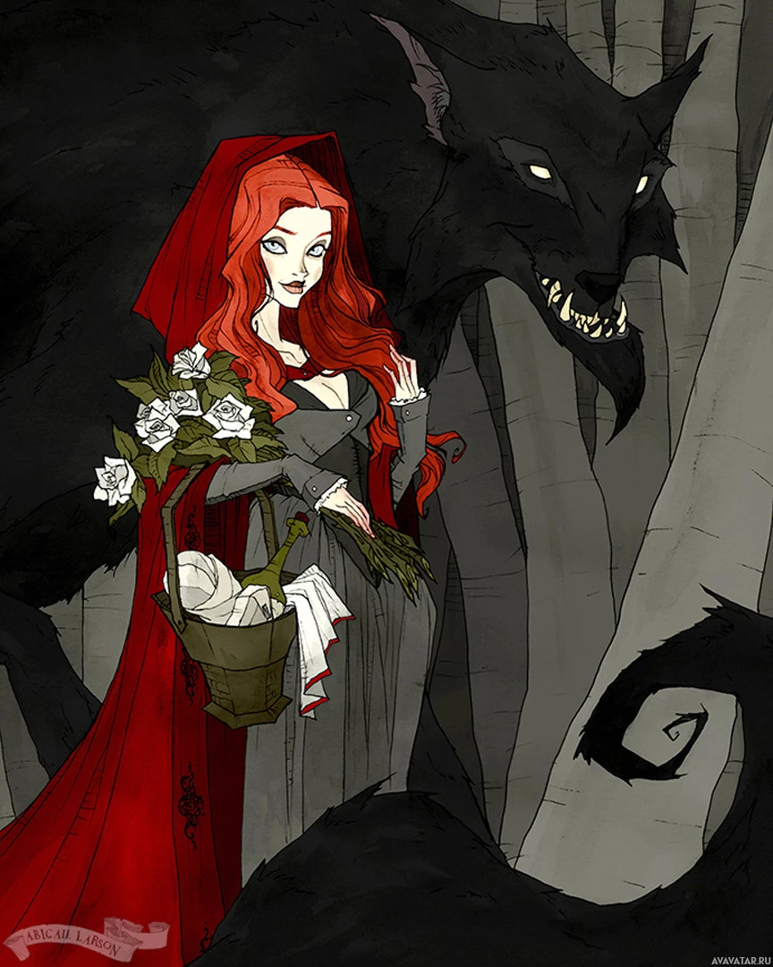 red hair and is wearing a hooded cloak, which is often associated with her character in fairy tales. The wolf, another