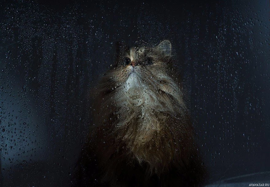 На снимке изображен кот, выглядывающий из окна. Похоже, идет дождь, о чем свидетельствуют влажное стекло и положение кошки в помещении. Кошка кажется любопытной или внимательной к тому, что она видит снаружи.