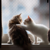 dark fur, while the other is a kitten with lighter-colored fur. Both cats seem to be engaged in some form of interaction or