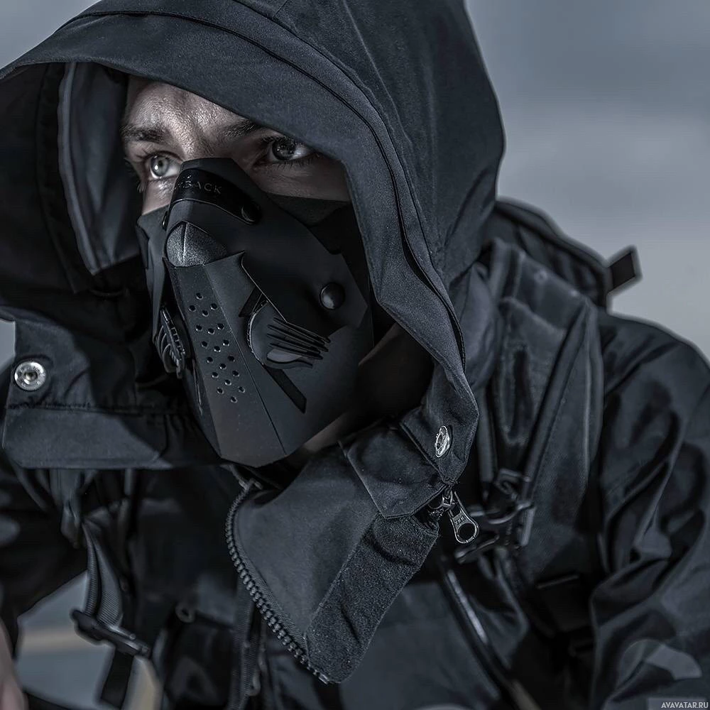 The image depicts a person wearing a hood and a mask, which appears to be a respirator with filters. The individual is dressed in