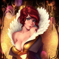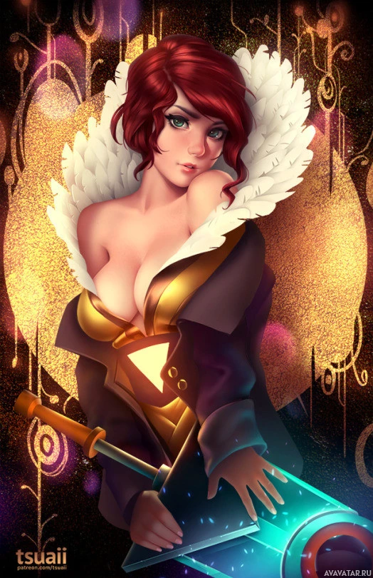 a female character with red hair. She is dressed in