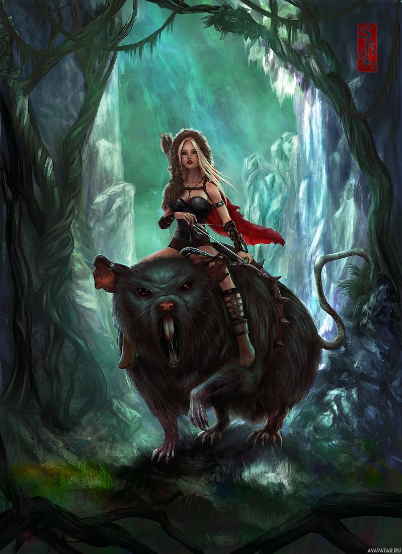 In the image, there is a character that appears to be an elf riding on the back of a rat. The setting seems to be a forest or jungle with
