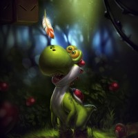 dinosaur character. He appears to be in a forest setting with trees and foliage around him. There's also what looks like a message or note on a branch in front of him, suggesting that he might be about to read or interact with it. The game reference suggests that this character is often associated with the Mario franchise where he typically has adventures with the other