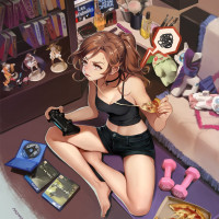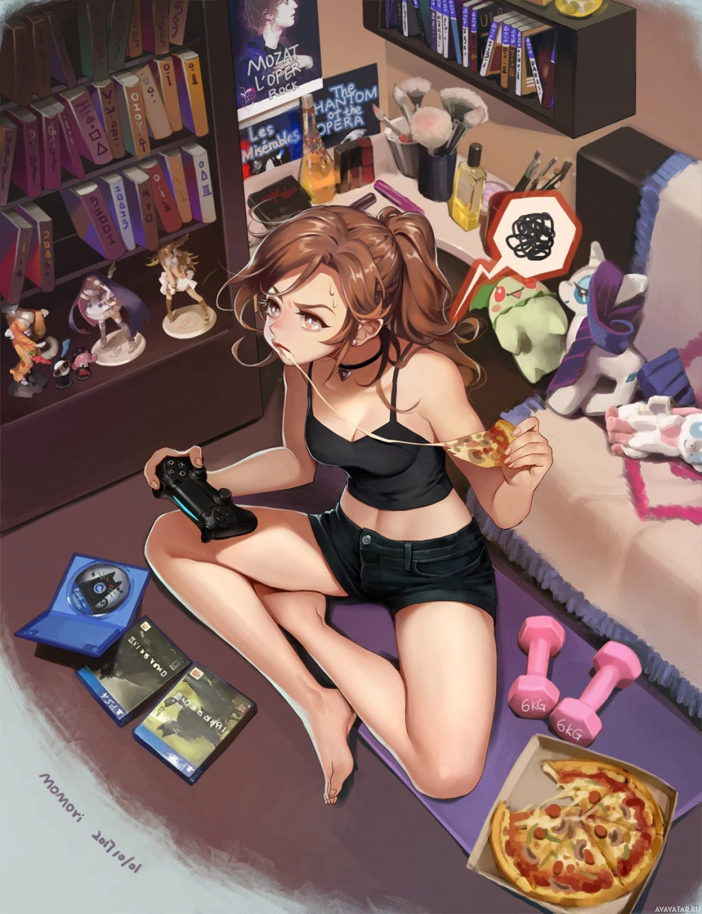 a black top with a black choker. In her hand, she holds what appears to be pizza. On the shelf behind her are various items such as books, figures, and other trinkets that suggest she might be a gamer or collector of