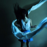 a blue fabric or material flowing around her, creating a dynamic and ethereal atmosphere. The setting looks like