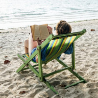 a lounge chair at the beach. The person is wearing sunglasses and has their feet propped up on another chair, suggesting they are relaxed. They appear to be reading a book or looking down at something in their hands. The background features a clear sky with some clouds, indicating it might be