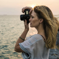 the warm light in the sky. She is holding up a camera and taking a photograph of the scene. Her hair is blowing slightly due to the wind coming off the water. It looks like she is capturing a personal moment or