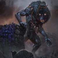 sharp teeth, stands on all fours atop what looks like a stone structure. It has its mouth open as if roaring or growling. In front of the werewolf, there is