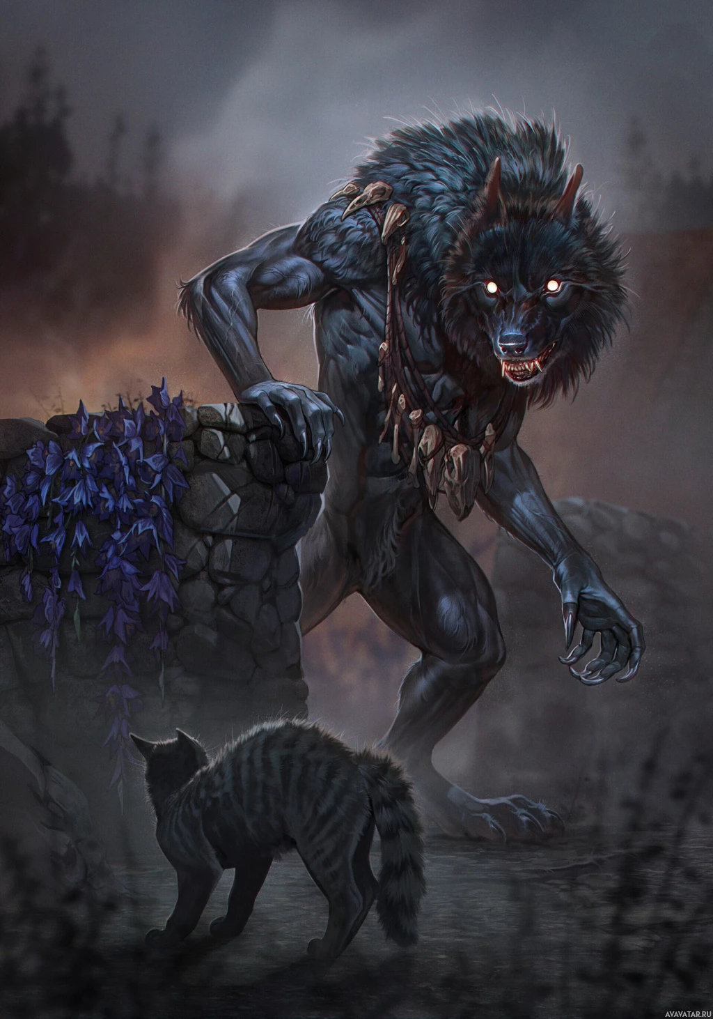 a fantasy scene featuring a werewolf and a cat. The werewolf, which is anthropomorphic with human-like posture and facial features but also with the appearance of an animal's fur and