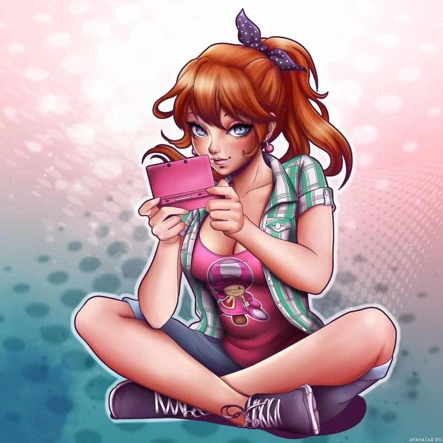 red hair, wearing a green and white striped shirt. She has a bandana in her hair and is sitting cross-legged on the ground while using a pink Nintendo 3DS