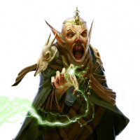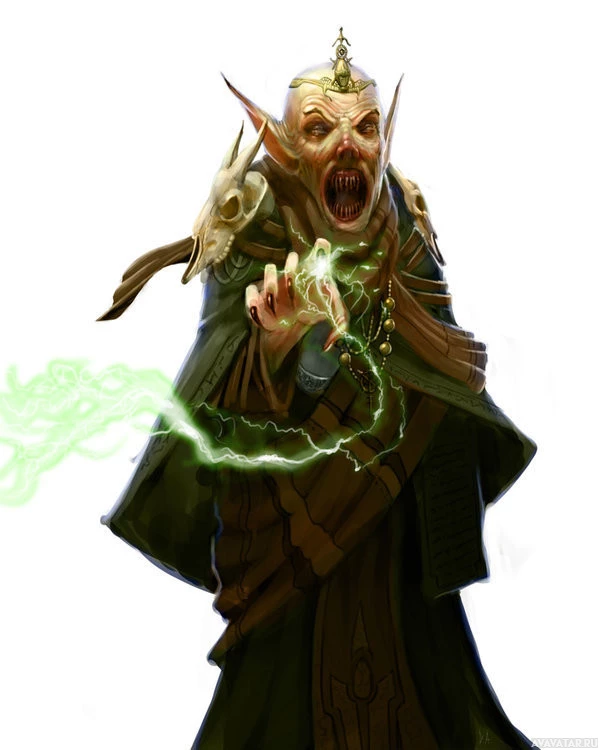 The image features a fantasy-themed character, often referred to as a warlock or sorcerer. This character is depicted with an ominous appearance, featuring