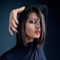 dark hair, wearing makeup that includes red lipstick. She is dressed in a black