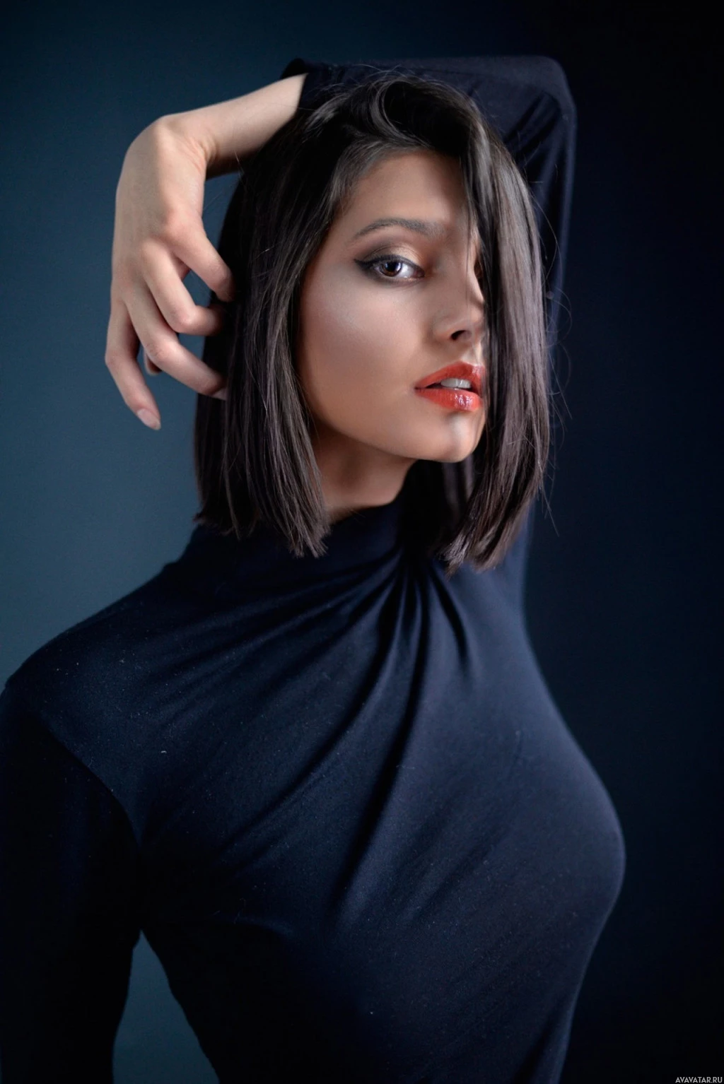 turtleneck top and has her hand on her face in a thoughtful or contemplative pose. Her expression seems serious or introspective. The background is neutral-toned, which helps to keep the focus on her.