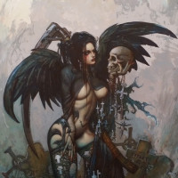 a fantasy scene featuring a character that resembles the mythical figure of Lilith, often associated with demonic or supernatural themes. This character has wings and horns, typically seen as symbols of evil or fallen angelic nature in
