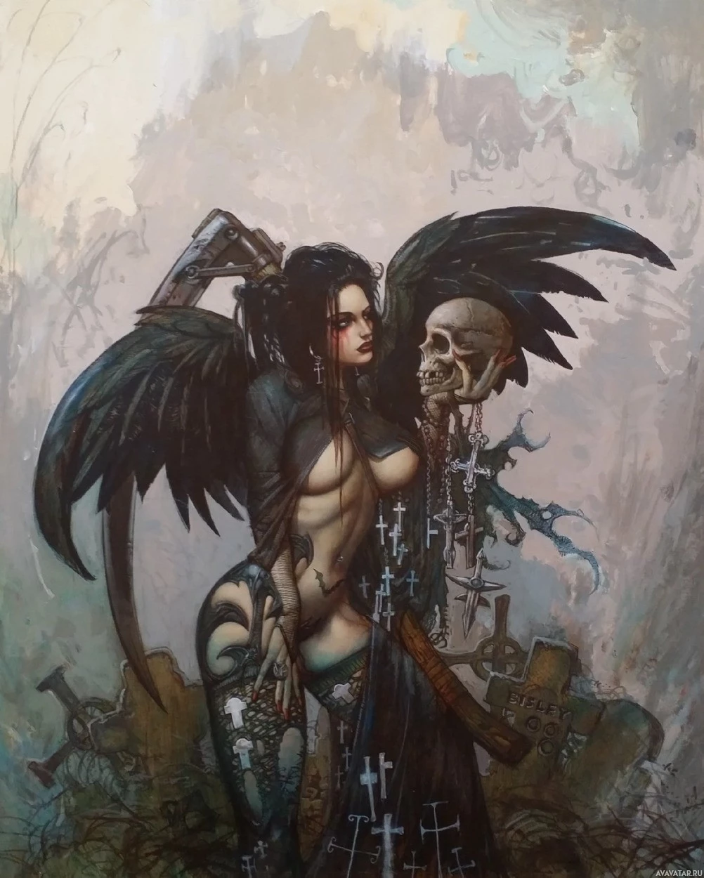 a common symbol for death or mortality in such contexts. The artwork is rich with detail and color, giving it an atmospheric and somewhat