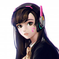 the video game "Overwatch." She is wearing headphones with a microphone, which is