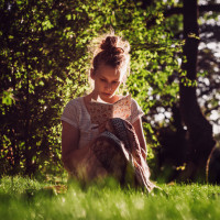 a light dress with her hair tied up. The girl is looking down at a book she's holding in her hands. Her expression seems contemplative as she reads. There are soft focuses around the edges of the image, suggesting