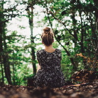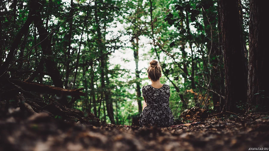 На картинке изображена девушка, сидящая на упавшем дереве в лесу. Она, кажется, сзади и смотрит на что-то за рамки фотографии. Окружающая среда предполагает естественную обстановку с деревьями и листвой вокруг нее.