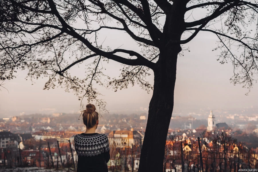 The image features a person standing in front of a tree with their back to the camera. They are looking out at a cityscape that includes buildings and what appears to be a church or a building with a steeple, suggesting it could be