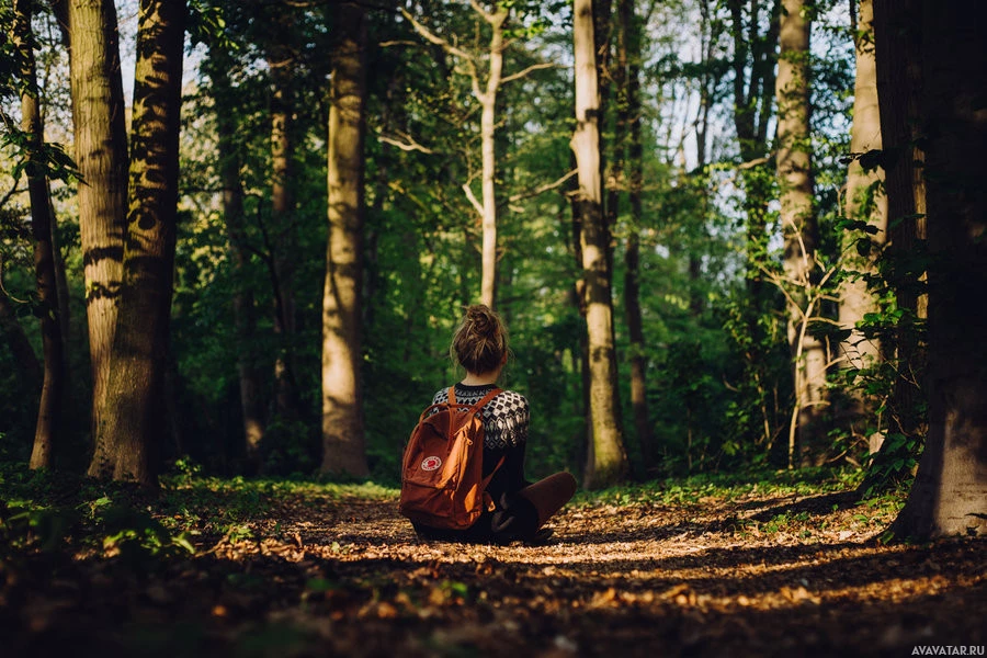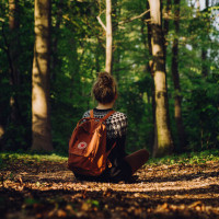 the ground in a forest. The individual appears to be wearing a backpack and looking towards something or someone out of frame. They are surrounded by trees and greenery, suggesting that it might be