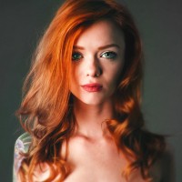 loose waves that frame her face, which gives the portrait an ethereal quality. There's also visible tattooing on her left arm, adding to her unique appearance. The lighting in the photo is soft and evenly distributed across her features, enhancing the overall