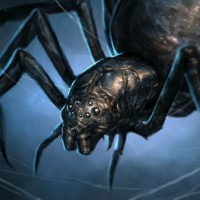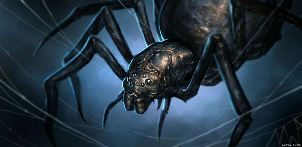 menacing spider. It is surrounded by webs and appears to be in an enclosed space with
