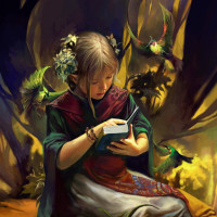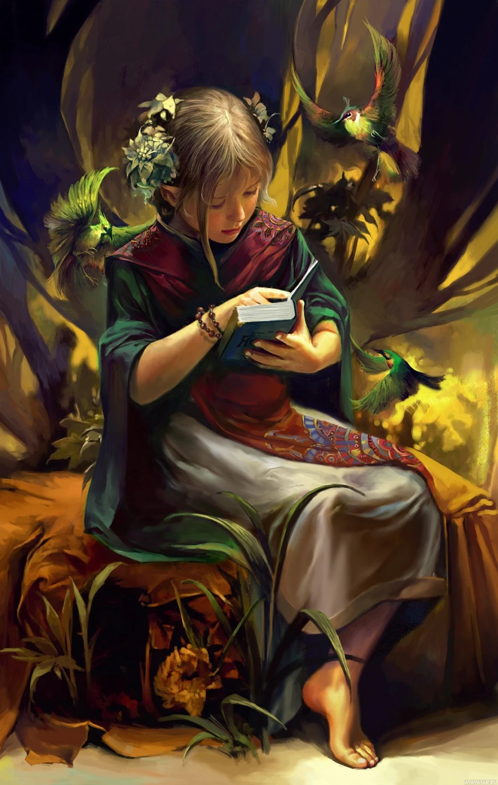 a young woman, possibly an elf given the context and the presence of what appear to be birds with wings that resemble those of parrots. She is sitting on a stool or a low bench and is engaged in reading a book. The