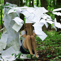 unusual scene creates a metaphorical representation of being overwhelmed by tasks or documents. The setting appears serene and natural, contrasting with