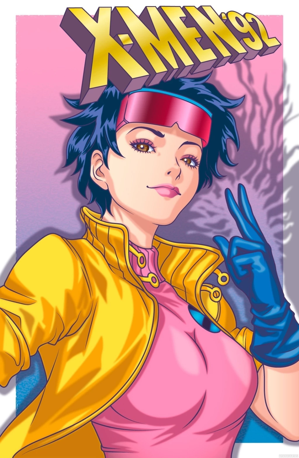 yellow top with pink sleeves and gloves, which are often associated with her character in various X-Men media. The artwork showcases a close-up of the character's face, with