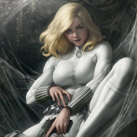 На картинке изображена женщина-персонаж со светлыми волосами, одетая в белый костюм. Она держит пистолет в руке, сидя среди паутины. Ее выражение кажется вдумчивым или созерцательным.