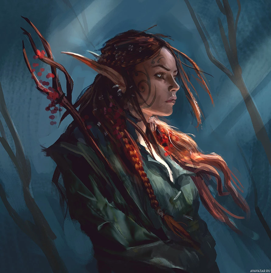 a fantasy character, an elf with red hair. The elf is standing in what appears to be a forest or