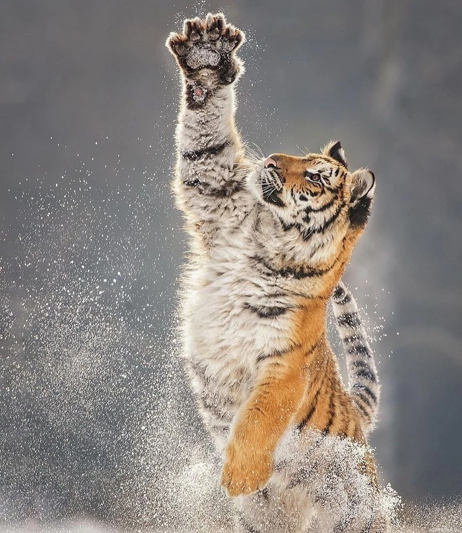a young tiger playing in the snow. It is raising its paw up towards its face, and there's visible snow around its paws indicating that it has been active in this environment. This captures the playful behavior of