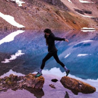 a mountainous environment, and she's wearing shoes that look like they could be waterproof or designed for hiking. The setting is near a lake surrounded by mountains, suggesting this might be in a high-altitude area such as