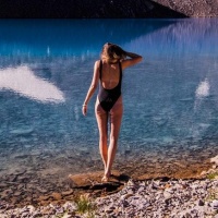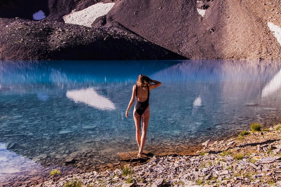 the edge of a lake. The individual is facing away from the camera, looking out towards the water and