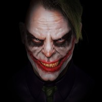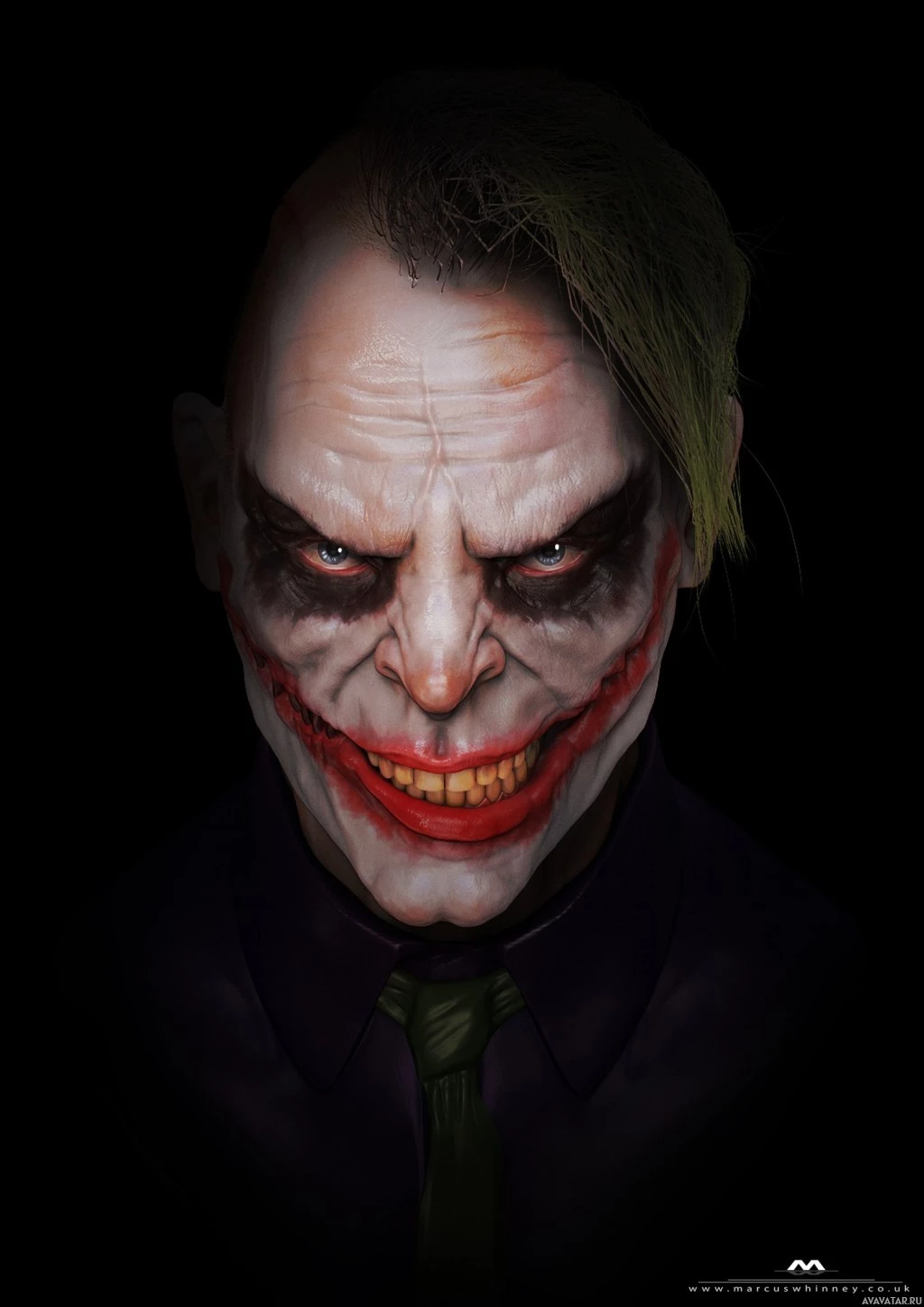 The image features a character known as the Joker from the "Batman" series. This character is depicted with his iconic white skin, red lips, and green hair, all of which are characteristic of his persona in various media like films and comics.