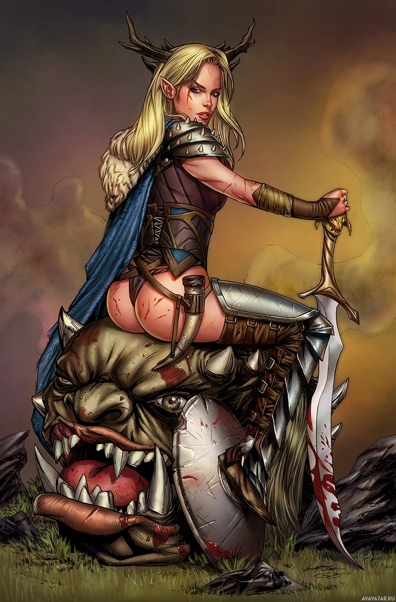 The image depicts a fantasy-themed illustration of an elf. She is shown from behind, riding on the back of a creature that resembles a dragon or