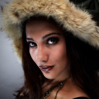 a neutral expression and is looking directly at the camera, which suggests she is aware of being photographed. The background is plain and does not provide any additional context about the setting. Her attire could imply that it's cold outside or that she's dressed for a winter season or a thematic event related to snow or
