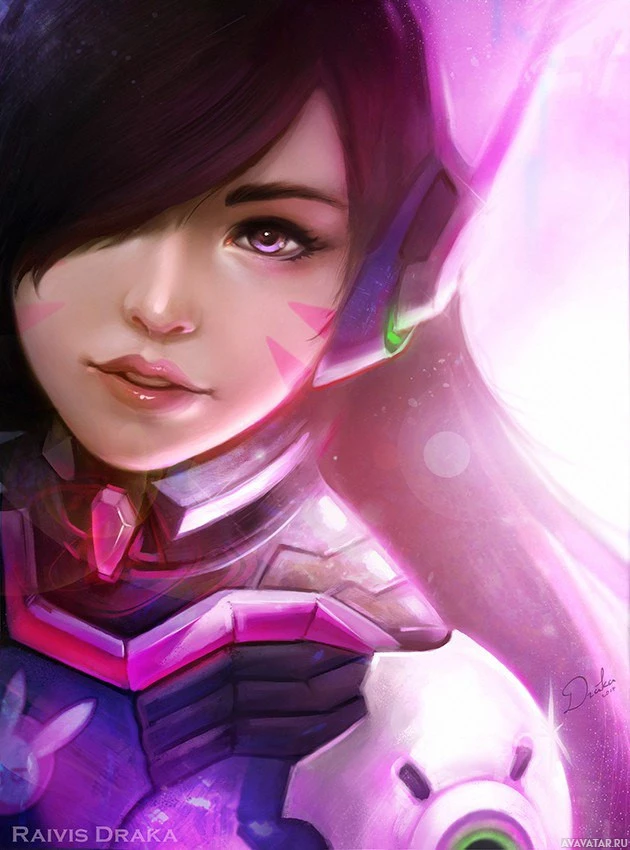 cybernetic armor, which includes a helmet and a visor that covers her eyes. The background features a cosmic or starry theme in pink and purple hues, highlighting her as the central figure of the image. The artwork seems to be a digital illustration, showcasing D.Va's