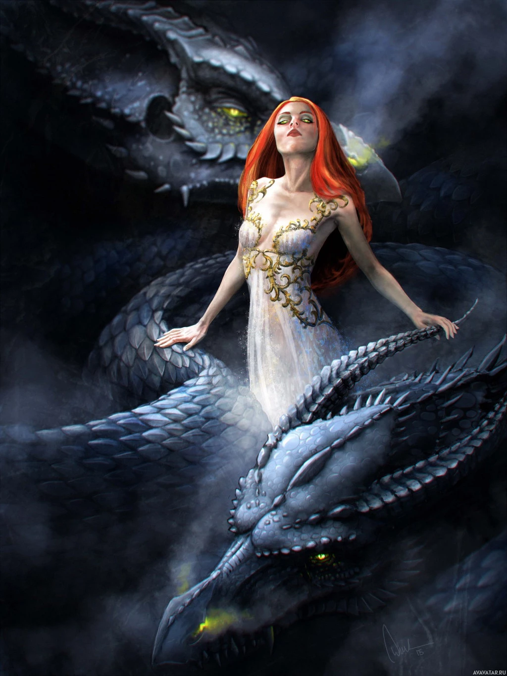 The image depicts a fantasy-themed artwork featuring a red-haired girl, possibly with facial features resembling a dragon or