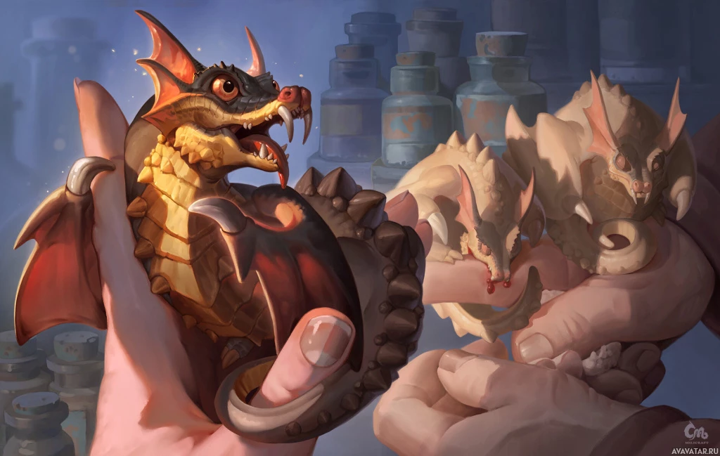 The image shows a stylized, fantasy-themed illustration of a dragon being held by