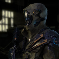futuristic armor, including a helmet and protective gear. This character is equipped with a weapon that appears to be a firearm of some sort, suggesting they are prepared for combat or conflict situations. They stand amidst