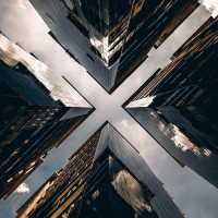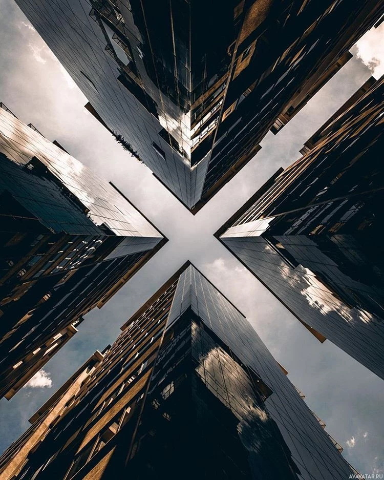 a city skyline with tall buildings, creating an optical illusion effect. The perspective is such that it looks like the buildings are leaning inwards towards each other, forming an "X" shape when viewed from