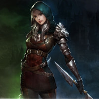leather pants, and a belt with various pouches. Her right hand is holding a sword, suggesting she is a warrior or fighter within the game's context. Her left hand rests on her hip in