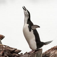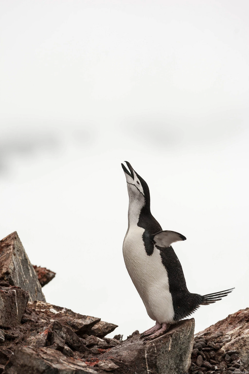 На снимке изображен пингвин на скалистом берегу. Пингвин стоит прямо, и его клюв открыт, как будто он вокализирует или общается с другими. Фон предполагает прибрежную среду с водой поблизости, возможно, после прилива.