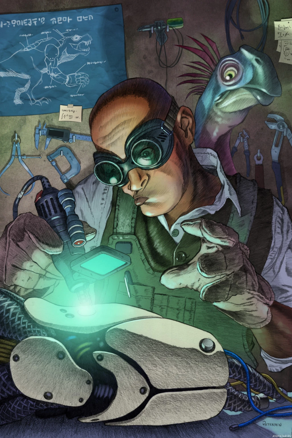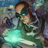 The image features an illustration of a man working with electronic or robotic components. He appears to be a scientist, engineer, or technician given his attire and the tools he's using. He is wearing goggles and has various